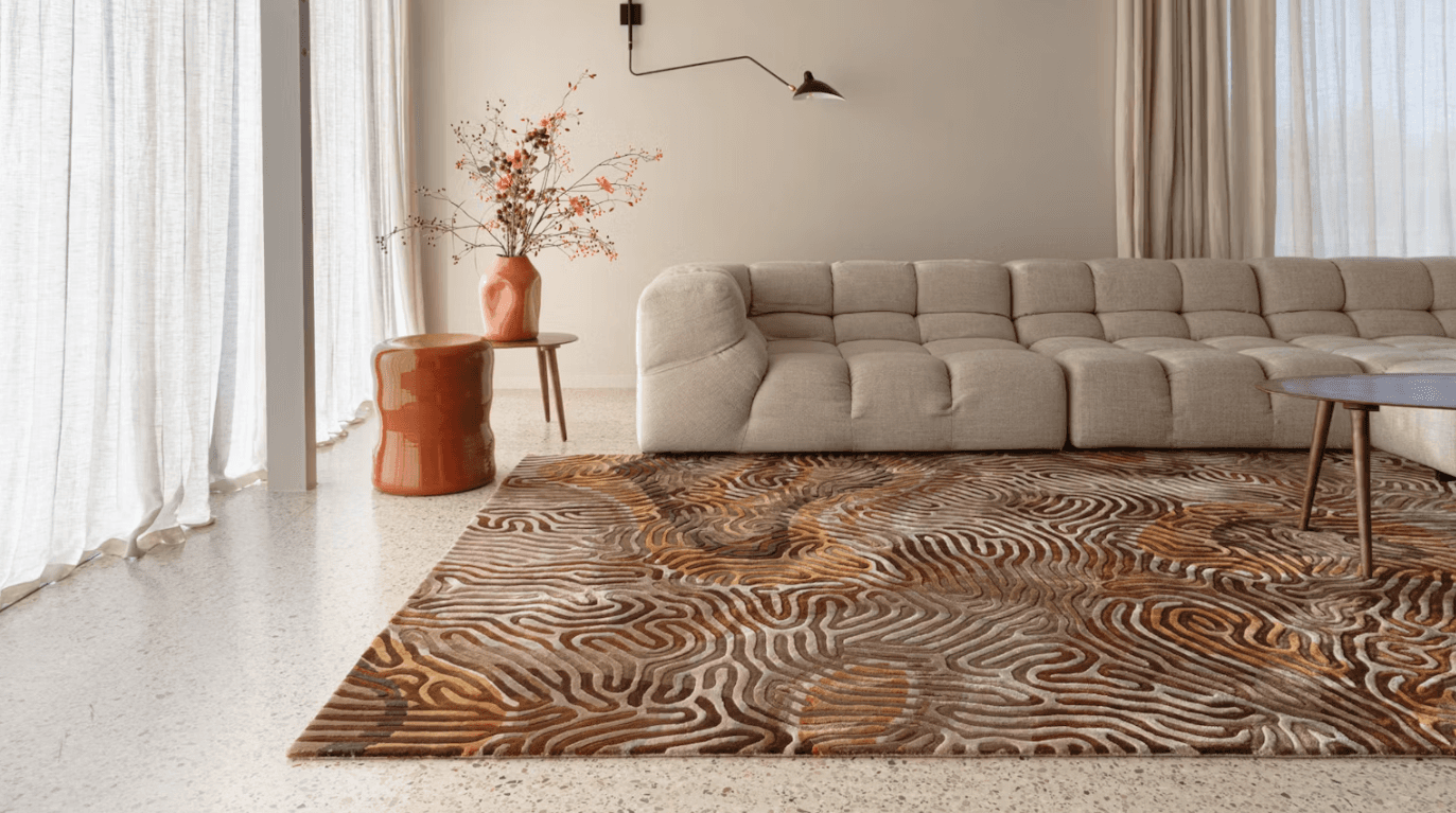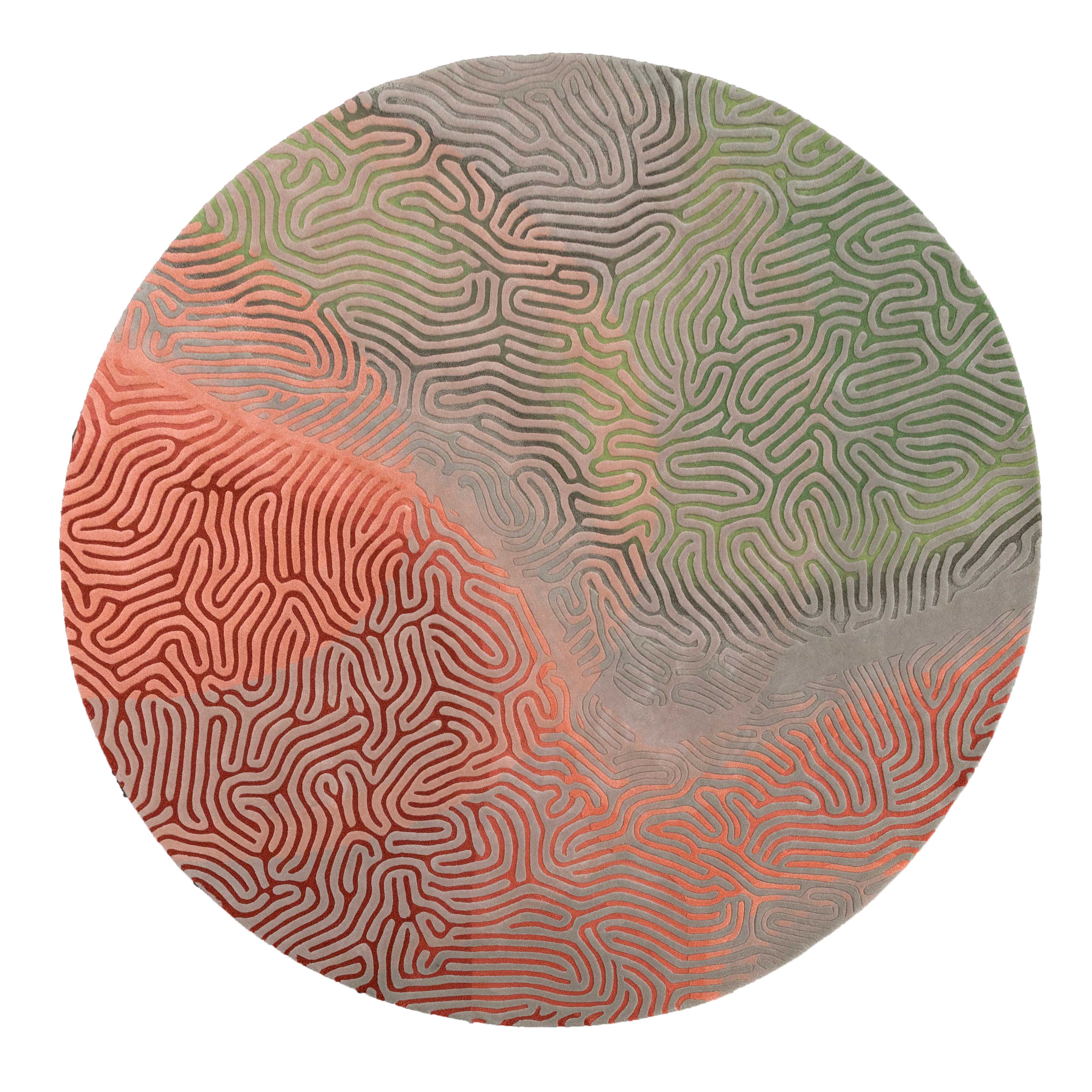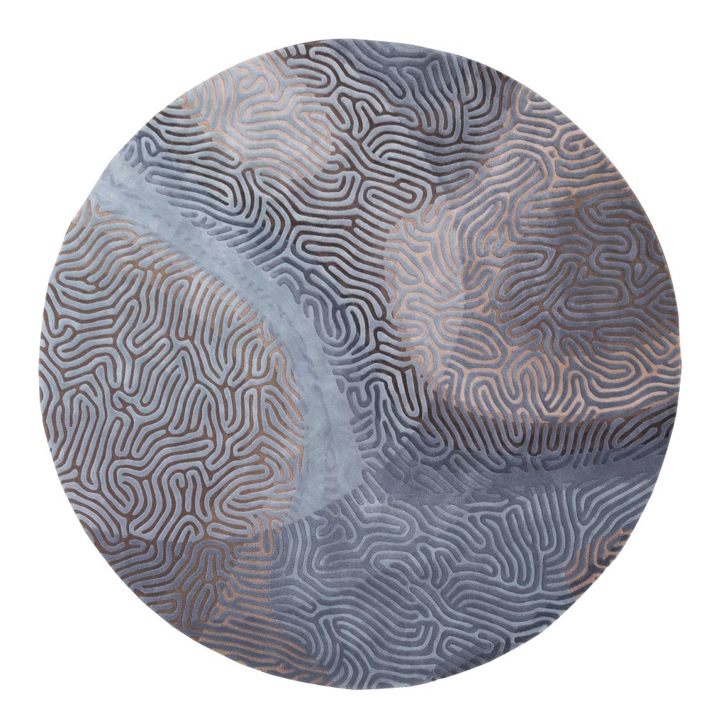 The patterns generated by the same chemical dynamic deliver the labyrinth-like array of the rug. A seemingly random arrangement of folds or waves as seen in brain tissue or indeed, brain corals. The maze-like structure is an enticing combination of interlocking geometric patterns that twist and turn leading the eye back and forth on a never ending journey.
