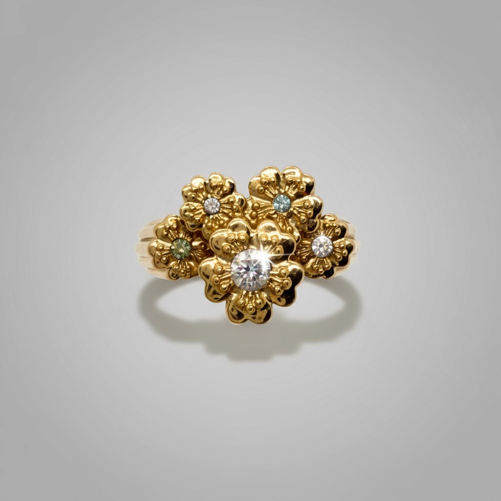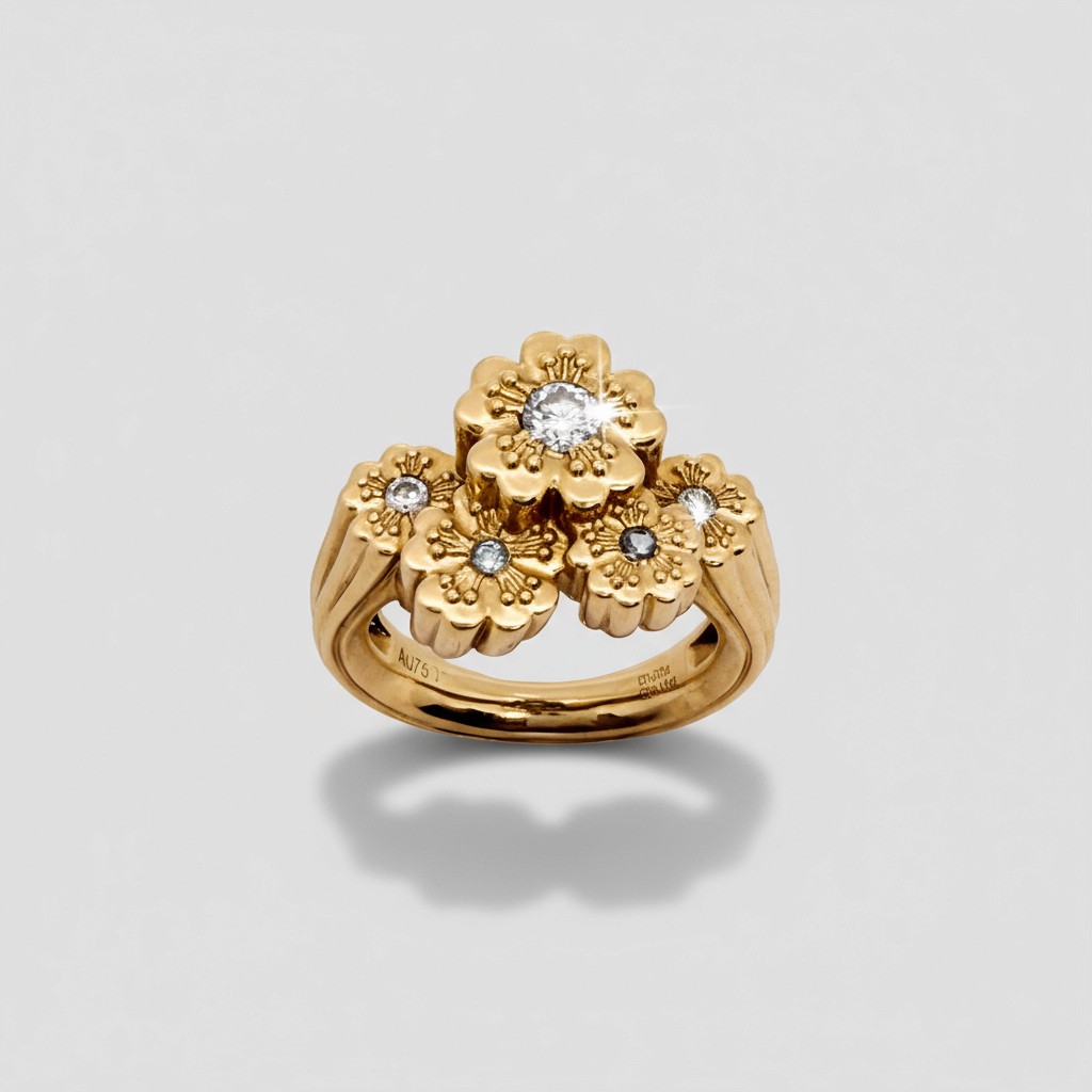 Five of these historic blossoms are cast in 18-carat gold. At the centre of the arrangement sits a central diamond. A personal touch lies at the centre of each surrounding blossom; instead of more diamonds, they are set with custom-cut sapphires and emeralds. Each stone matches the colours of children’s eyes, making the ring a permanent, wearable portrait of a family.